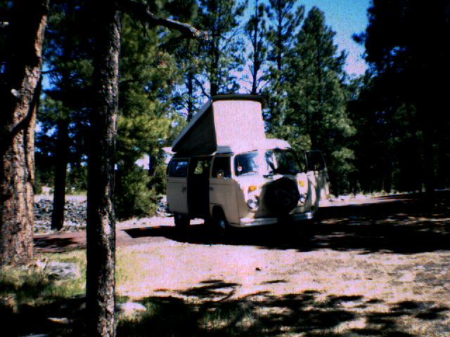 We made slow progress yesterday, partialy to taking it easy on the new engine, partially because we have a habit of finding things to do. We're working on finding things to do that we can do while we drive. ;-) The drive to this point was largely uneventful, just a straight shot accross the CA desert, and up the hills to AZ. The bus has performed well, managing about 18mpg for the most part. I'd like more, but I can settle for that right now. Of course, the uphill stretches killed both our mileage and our speed... One thing you can say about the climate: cold. It was down in the mid 40's last night, which is much cooler than I had anticipated. Brr. We had a small fire to help, but it was one of those nights where one side is always cold... This morning it's starting to warm up, but it's not exactly comfortable just yet. One major problem: the percolator we got at WalMart doesn't work. One could safely say we are not pleased about this development. I finally gave up on making it work and just dumped the coffee in the pot it self. We'll do the old boil and strain thing. Yuck. Wish I'd brought my portable drip setup. Oh well...